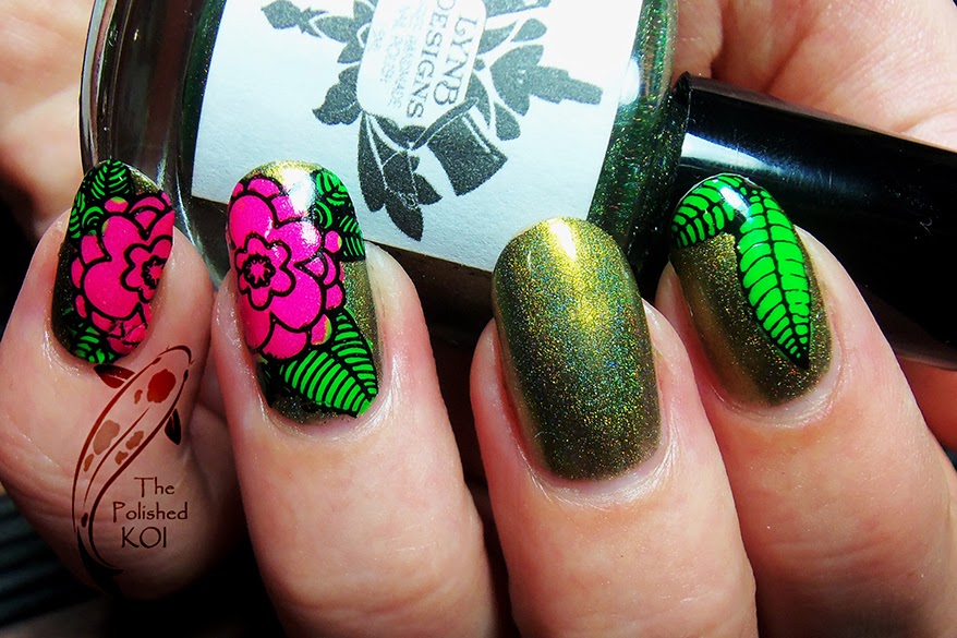 I added a sunflower accent using UberChic plate 3-01, using black MdU of course, and filled in with LynB Designs neon yellow -YOLO. The gold center is done with Bold Gold from Maybelline.