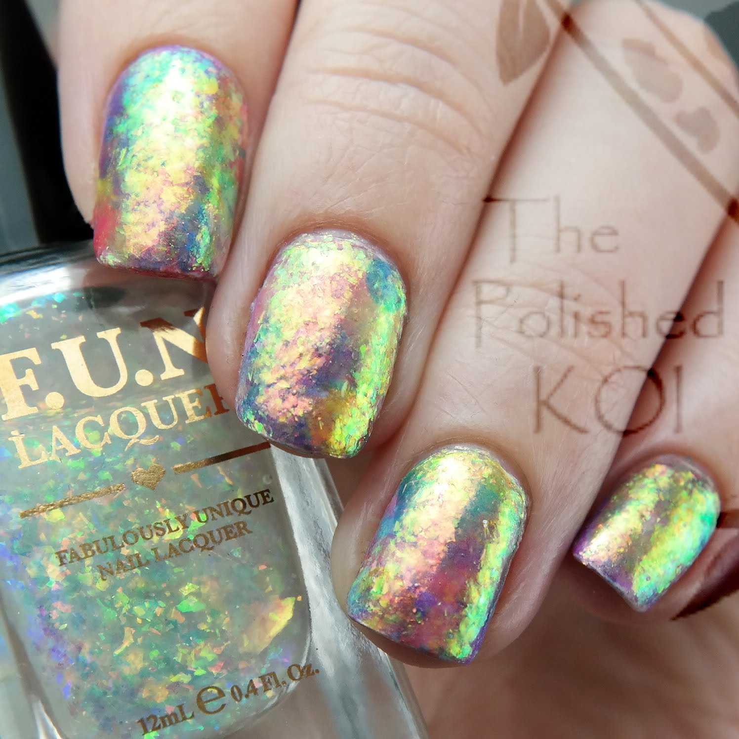 One lovely day, I went to visit my cousin and have a polish play date - I took my recently acquired silicone mat to show it off to her as it was still a new item at that time, and lo and behold - was super surprised to see some indie nail polish on her shelf. She's a mainstream kinda girl and hasn't gone down the indie rabbit hole, so what's F.U.N Lacquer doing on her shelf?! I didn't own any myself...it's still an expensive brand, imo. But there was Magnificent, twinkling at me like a pretty gem. My cousin let me use some, and by that I mean I painted strips of it on my silicone mat and reverently took it home to put together the opal mani I've been thinking about. I used about 4-5 coats and because the base is clear, they looked like floating flakes so the effect was super neat once I had a base color in place. My cousin, however, was confused on why I only painted 5 swatches when I have 10 nails..ha ha.. obviously Cindy wasn't getting something this glamorous!