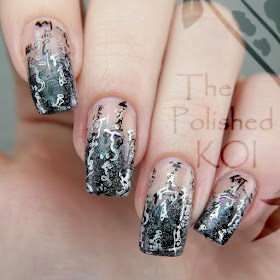 Inspo this time is from Brethil/Druid Nails - she has done this fancy french tip design, using a combo of foils and stamping. I cheated and passed on the foils but still think I came pretty close!
